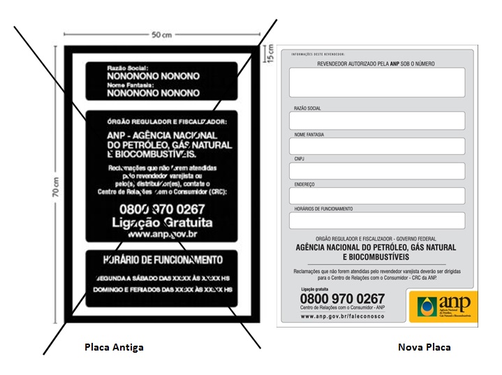 Já o Quadro de Avisos, além de novas dimensões e características, DEVERÁ ESTAR LOCALIZADO “NA ÁREA ONDE ESTÃO LOCALIZADAS AS BOMBAS MEDIDORAS, DE MODO VISÍVEL E DESTACADO”, ou seja, na área/pista de abastecimento. Além disso, devem ser confeccionados nas mesmas cores exibidas no modelo disponibilizado pela ANP.